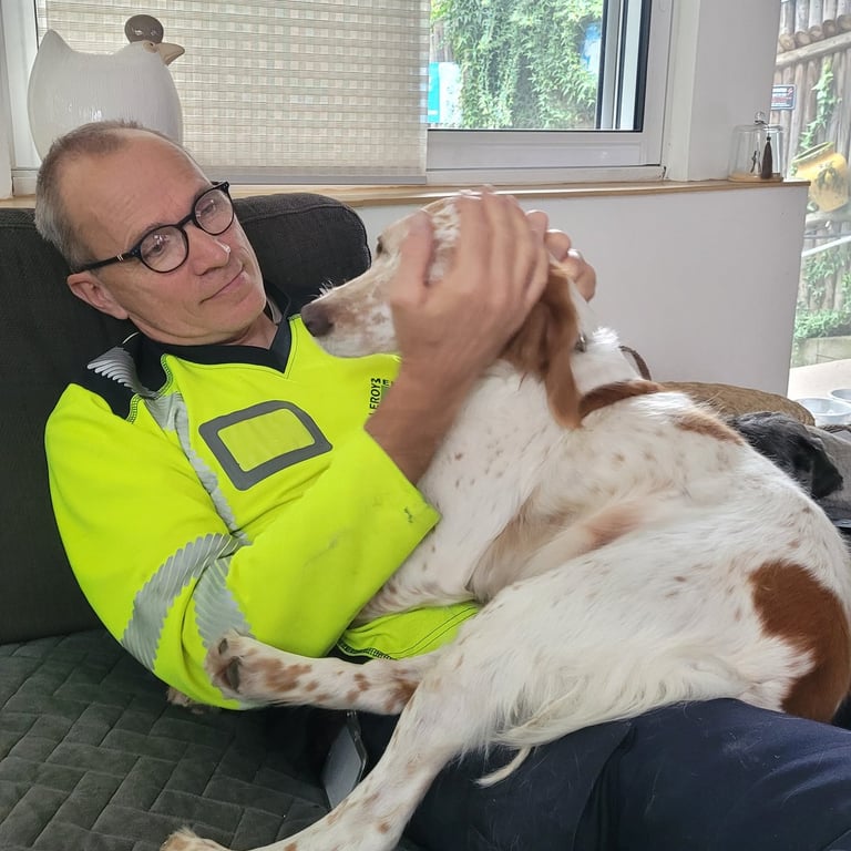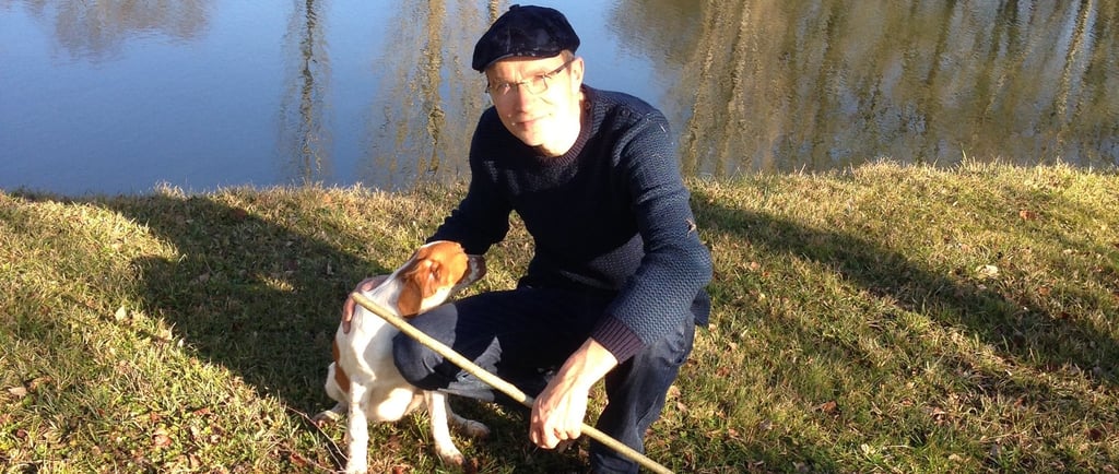 Biscotte est une petite épagneule bretonne de 7 ans, que je suis allé chercher du côté de Bordeaux. En Alsace, on ne trouve pas beaucoup d’épagneuls bretons, et encore moins de femelles. Pas pour la reproduction, non, mais simplement parce qu’une femelle, ça ne lève pas la patte contre les murs ou les jantes des voitures. J’ai toujours eu cette race de chien : c’est une race facile, rustique et gentille.