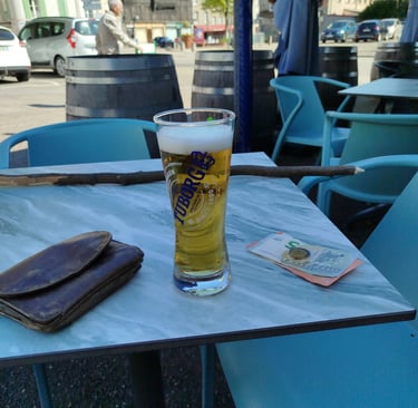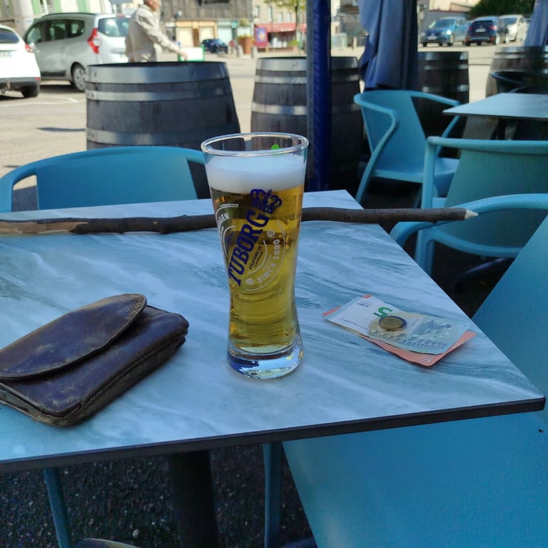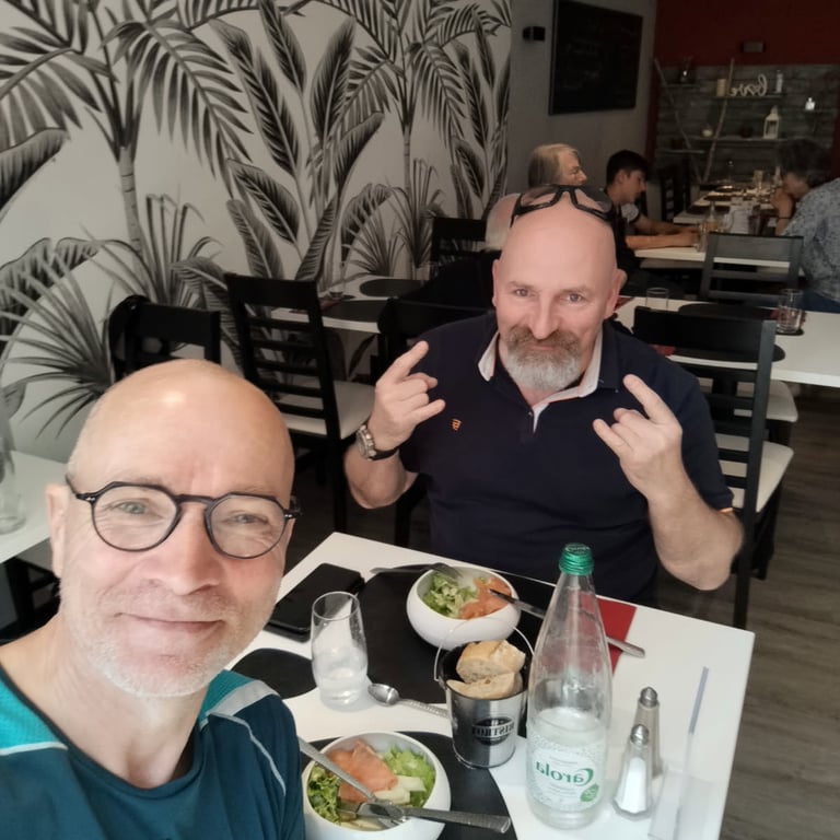 Je me suis arrêté à Marsal pour faire le plein de nourriture et panser les bobos. Pour moi-même et pour Biscotte : tous deux un peu abîmés. À 10h30, je me suis pris une bière — qu’est-ce que je l’ai appréciée ! J’en ai profité pour envoyer un message à… je n’ai pas vraiment de mot précis, mais disons un membre de la famille : Claude. Je lui envoie une photo de ma bière, bien méritée, et Claude me répond : « T’es où ? ». Je lui dis : « À Dieuze », et du tac au tac : « J’arrive, on mange ensemble ». J’ai eu du mal à contenir mes émotions. J’ai mangé un bon steak, en plus de la bonne compagnie.