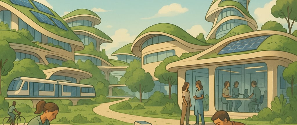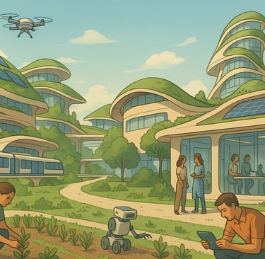 Les déplacements eux-mêmes incarnent cette philosophie : pas de voiture individuelle, pas de transport énergivore. On se déplace à pied, à vélo, ou en transport collectif silencieux et léger, adapté au relief, à la saison, à la communauté. Le déplacement fait partie de la vie, pas de la fuite. Il relie, il ralentit, il engage le corps à sentir le territoire qu’il traverse. Certains ne mettent jamais les pieds dans la ville technologique, si ce n’est que pour des raisons de santé. D'autres ne quittent que rarement les laboratoires. Il n’y a pas de mépris entre les deux. Chacun sait que l’équilibre du monde dépend de cette double polarité : la force du faire et la sagesse du vivre. Les deux lieux de vie et de travail sont reliées non par une route, mais par un jardin frontière. Un grand espace circulaire où les deux mondes se rencontrent : des enfants y viennent poser des questions aux chercheurs, des ingénieurs s’y assoient pour écouter des anciens parler du passé, et des artistes viennent peindre ce lien fragile entre la puissance et la paix. Ce fonctionnement est étendu sur tout le territoire.